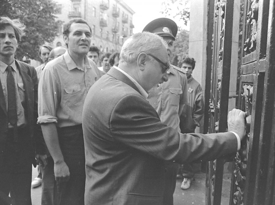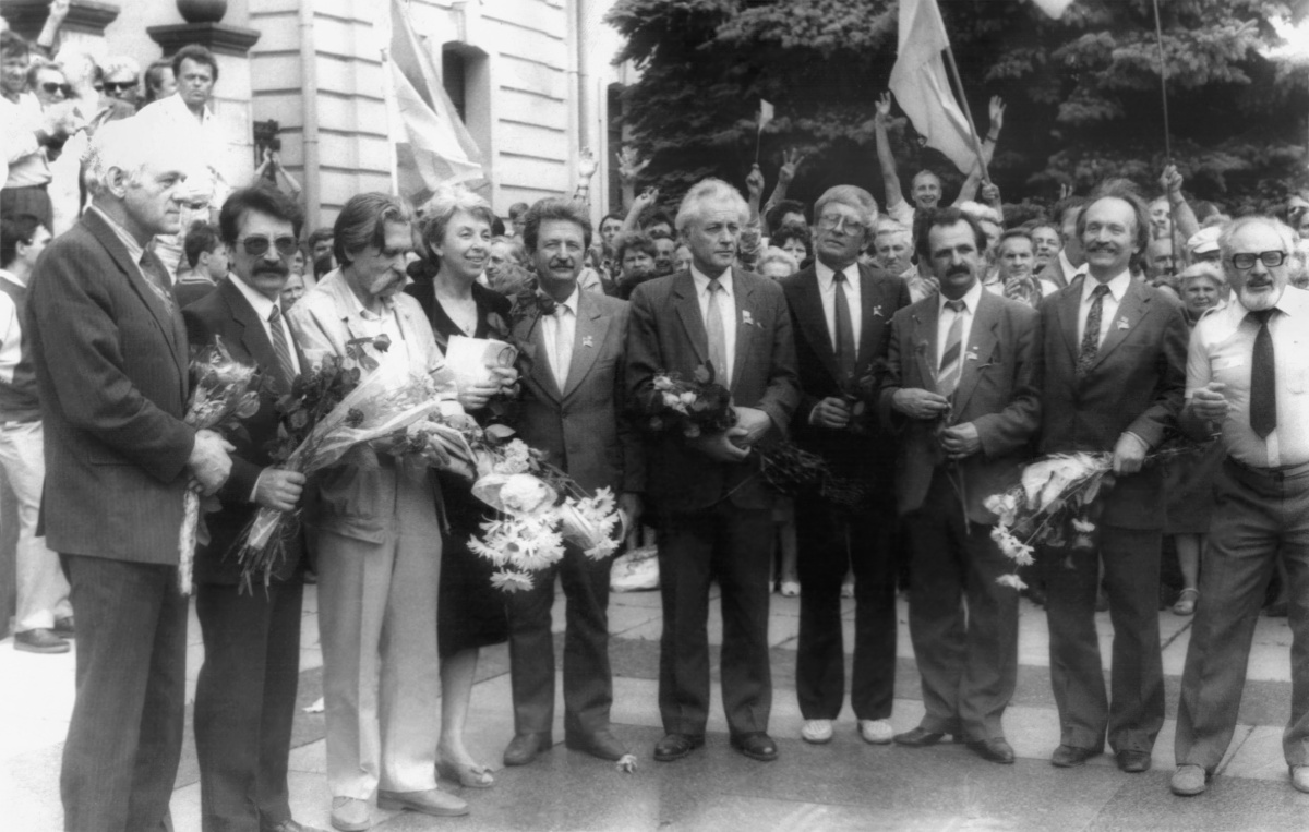 Депутати Верховної Ради, колишні політв’язні, у день проголошення Декларації про державний суверенітет України 16 липня 1990 року. Зліва направо: Левко Горохівський, Олесь Шевченко, Левко Лук’яненко, Ірина Калинець, Михайло Горинь, Степан Хмара, Богдан Ребрик, Богдан Горинь, Вячеслав Чорновіл, Генріх Алтунян.