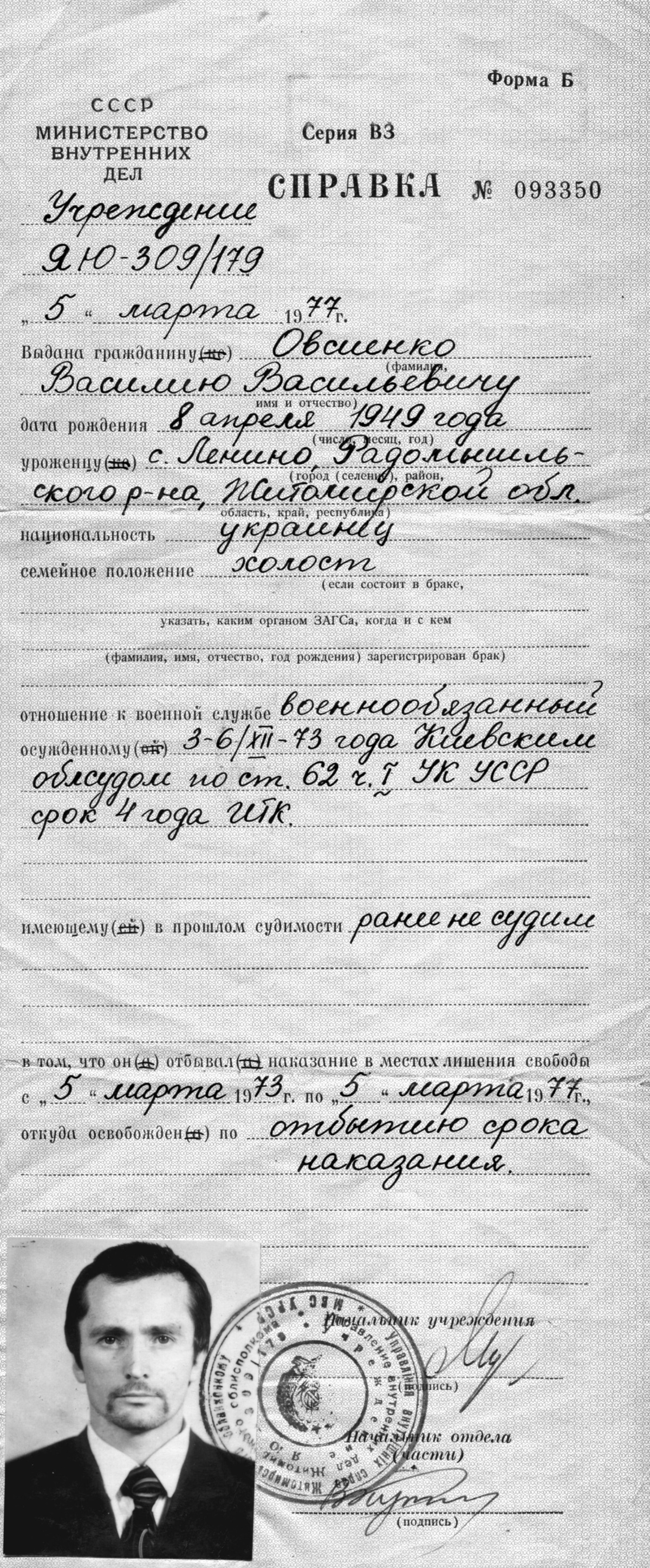 В.В.Овсієнко: Та ні, та ні! 62 стаття, частина друга. Ну, і звичайно, вони там привозили багатьох зеків, котрі засвідчували частково те, що я говорив, а частково те, чого я взагалі не говорив. Вони мали погане уявлення про мій світогляд. Ну, однак пішли такі звинувачення там, скажімо, як “називав Сахарова великою людиною сучасності” (це злочин великий), десь висловлювався про окупацію Афганістану, про голод 1933 року — це теж “клеветническое измышление”. От такого типу. Ну, тут уже не церемонилися — тут 10 років особливо суворого режиму, 5 років заслання і звання особливо небезпечного рецидивіста.
